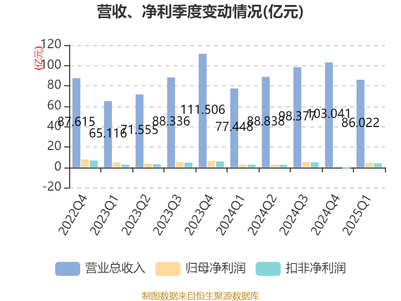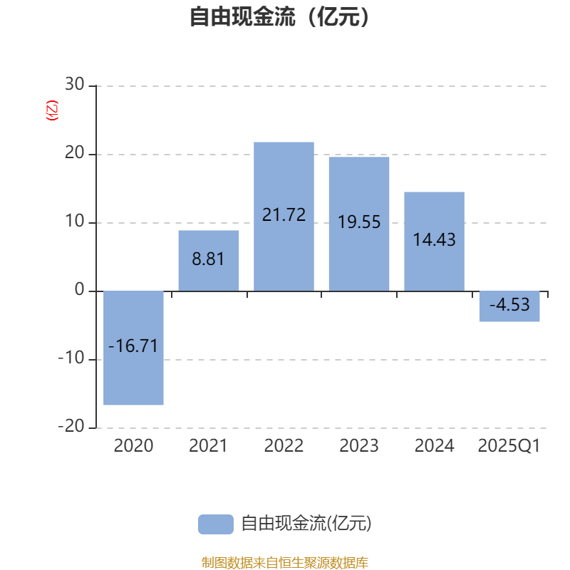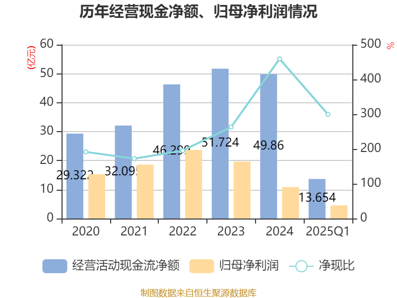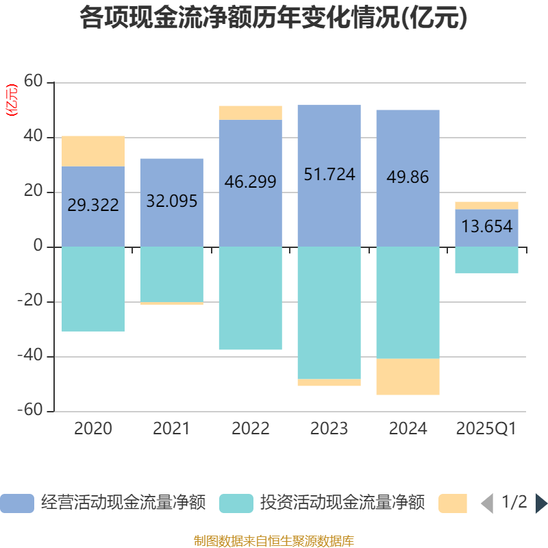 截至2025年一季度末,公司经营活动现金流净额为13.65亿元,同比下降12.35%;筹资活动现金流净额2.68亿元,同比减少12.09亿元;投资活动现金流净额-9.73亿元,上年同期为-10.76亿元。